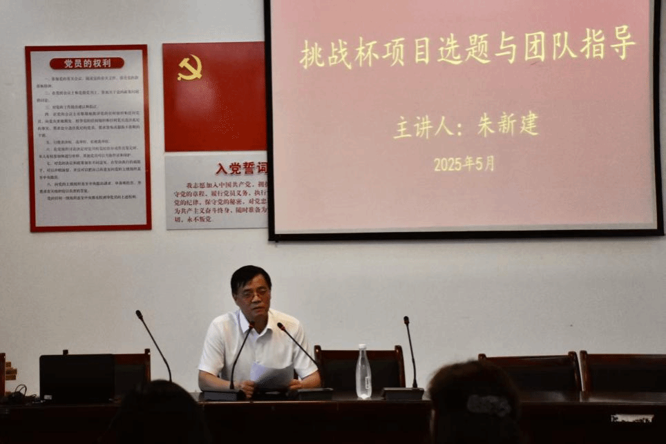 随后,朱新建院长从挑战杯赛事的育人意义、项目选题和团队指导三方面进行了深入浅出地分析并提出建议。一是,挑战杯赛事是学生思维与能力提升的重要途径,通过赛事平台的历练,学生不仅能提升专业成绩,还能锻炼创新思维、团队协作、沟通表达等综合能力;