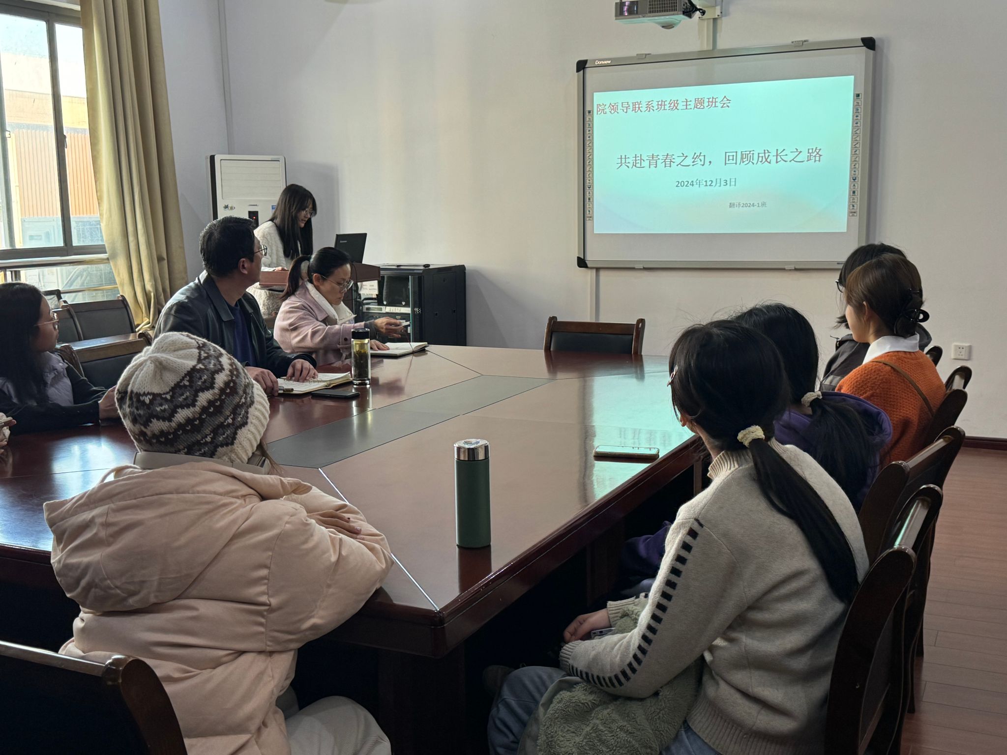 12月3日下午,翻译2024-1于学院楼308会议室开展了“共赴青春之约,回顾成长之路”主题班会。本次班会由班长吴姚主持,院党委副书记光辉、辅导员徐蒙蒙出席本次活动。