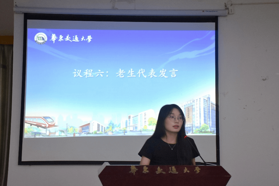 老生代表2022级翻译1班张鸣薇同学发言。她向新生们分享了在大学期间的经历和感悟,并以“长风破浪会有时,直挂云帆济沧海”“行远自迩,笃行不殆”“为有源头活水来”三句诗赠与全体新生,勉励他们奋发有为,开拓进取。